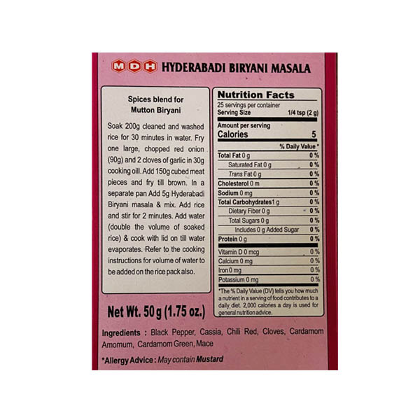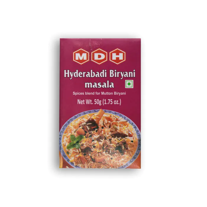MDH Hyderabadi Biryani Masala ,Its flavor is aromatic and fragrant, with notes of mint and saffron, and it comes in a powder form.